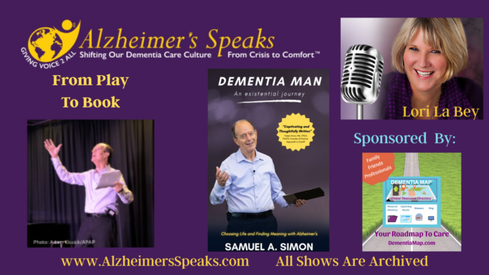 Lori La Bey, host of Alzheimer’s Speaks, with Sam Simon, who wrote and performed the play Dementia Man. He has now written a book with the same title, sharing more details of his dementia journey. Sam was diagnosed in 2018 with Mild Cognitive Impairment and in 2021 with Early-Stage Alzheimer’s. He is currently under medical treatment and a participant in a drug trial. Sam lives with his wife, Susan, who is also his Care Partner.