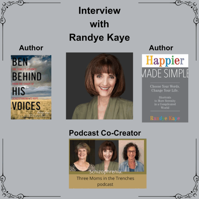 Randye Kaye is the co-creator and host of the popular podcast, Schizophrenia: 3 Moms in the Trenches. She is the Connecticut State Trainer for NAMI’s Family-to-Family Course, and is the author of Ben Behind His Voices: One Family’s Journey From the Chaos of Schizophrenia to Hope (Bowman & Littlefield,2011 and Front Porch Press audiobook 2022), and Happier Made Simple: Choose Your Words. Change Your Life (Front Porch Press, 2022). She’s also an actor, voice talent, radio broadcaster, audiobook narrator, teacher and speaker. She has spoken at CIT International, American Psychiatric Association, APNA, and The Missouri Behavioral Health Council.